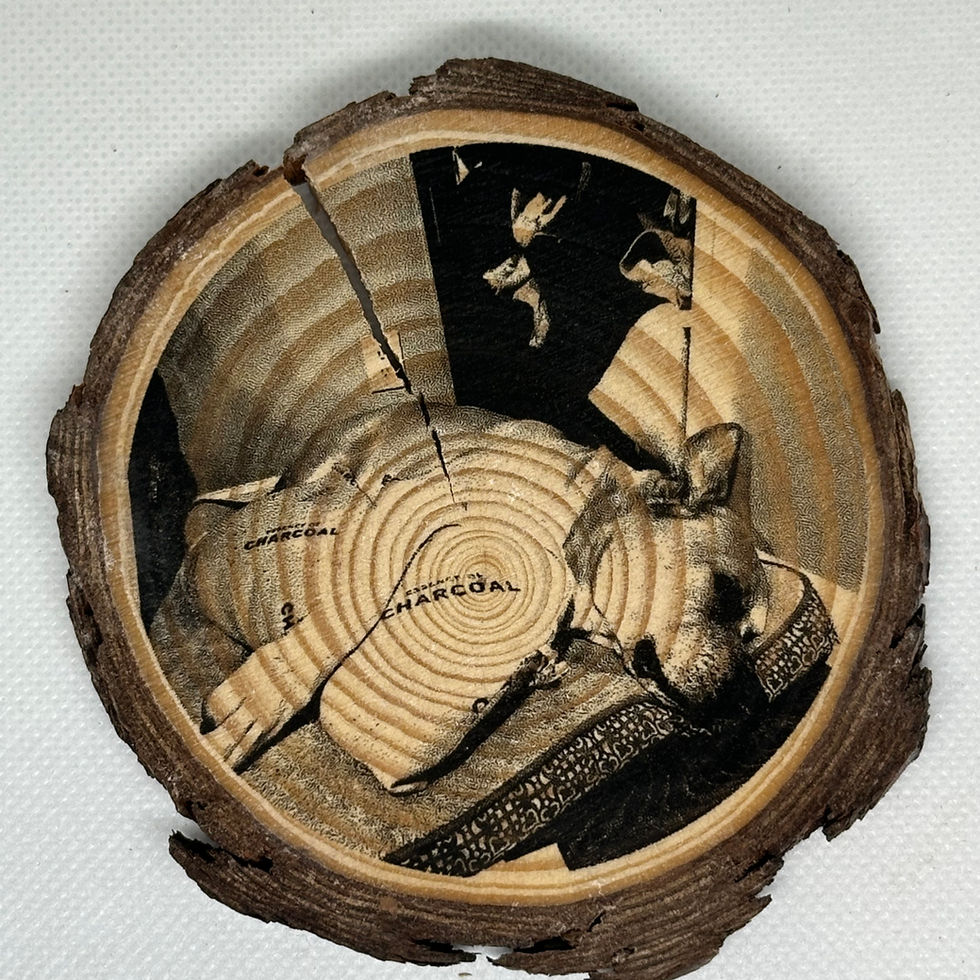 This small piece of wood has been cut into a circular slice, showcasing natural tree rings. It features a hole in the center, threaded with red and white twine, making it ideal for use as a rustic Christmas ornament or a charming gift tag. Additionally, we offer the option to engrave photos or designs onto the ornament, adding a personalized and unique touch to each piece.