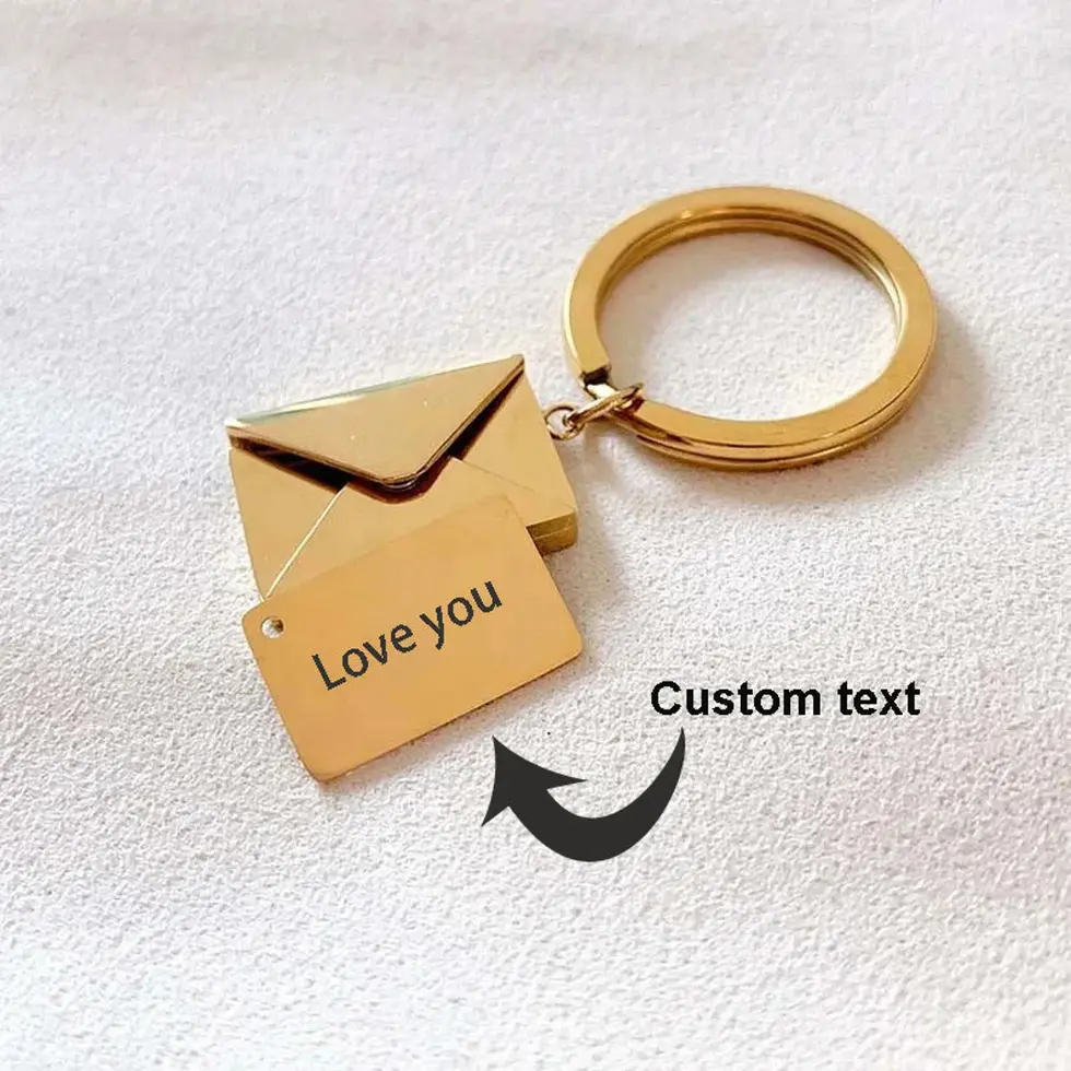 We offer these beautiful envelope keychains that are fully functional and open up to reveal a special engraved message for your loved one. Available in different colors, such as gold, rose gold, and silver, these keychains make the perfect gift for someone special in your life.