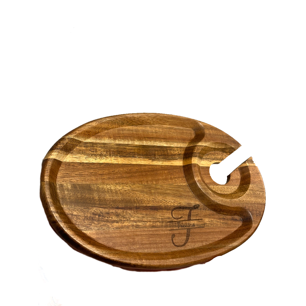 Custom Engraved Wooden Serving Boards Add a personal touch to your gatherings with these elegantly designed wooden serving boards. Perfect for wine glasses, charcuterie, bread, or appetizers, these boards feature a slot to securely hold your glass while you enjoy your snacks.